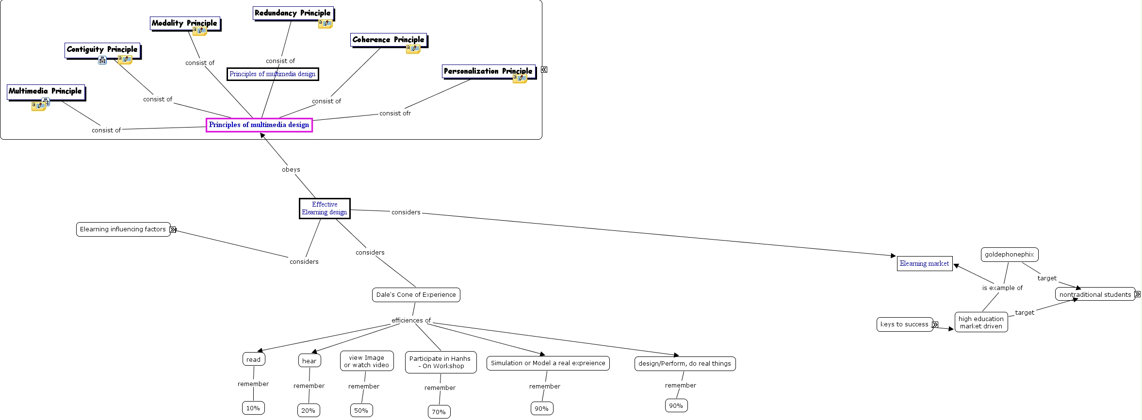 Effective learning design, Platform E-learning influencing factors, view Image or watch video remember 50%, what not is know, goldephonephix is example of high education market driven, E-learning influencing factors is copy right, network security is E-learning influencing factors, Modality Principle consist of Principles of multimedia design, key success ia convenience, key success of high education market driven, high education market driven target non traditional student