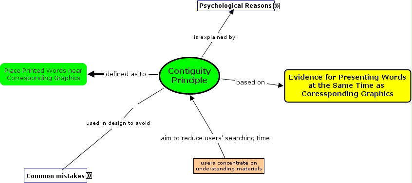 Contiguity Principle P, Contiguity Principle based on Evidence for Presenting Words at the Same Time as Coressponding Graphics, used in design to avoid common mistakes are Present Excercise Directions Separated from the Excercise, mouse-over solutions reduce size graphic, Psychological Reasons are contents are meaningful and eay to remember, Separate feedback from questions causes increase cognitive overload, Psychological Reasons are to use more cognitive resourses to use to mentally organized and intergrated materials, Contiguity Principle defined as to Place Printed Words near Corresponding Graphics, used in design to avoid common mistakes are Cover lesson Screen with linked Screens, mouse-over solutions text box overlaid on the graphics, used in design to avoid common mistakes are Present Excercise Directions Separated from the Excercise