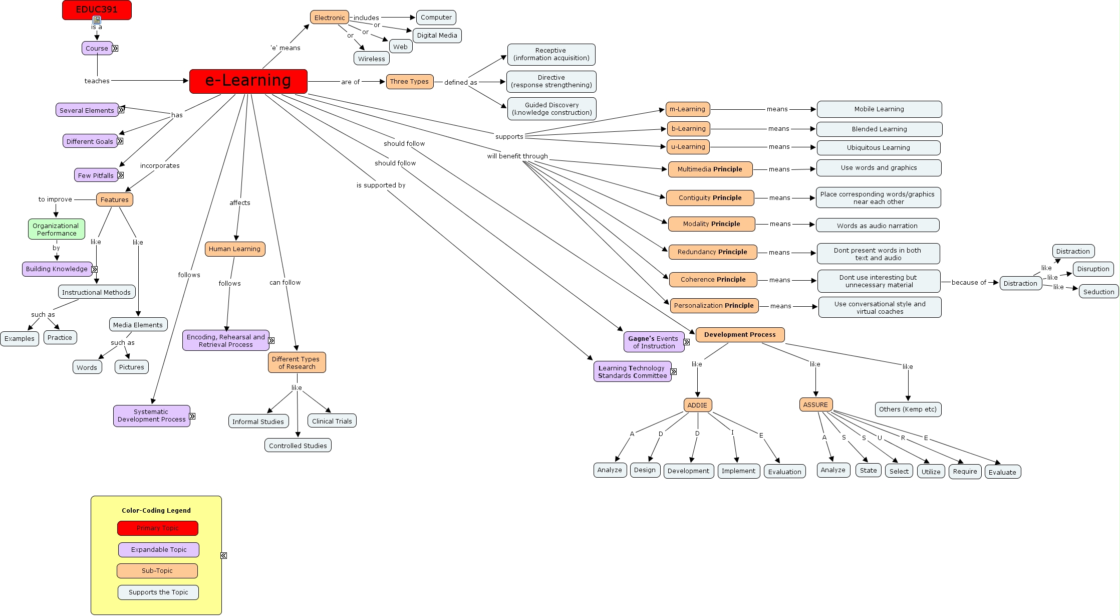 Sri Harsha Kolar (WK8), Features to improve Organizational Performance, e-Learning can follow Different Types of Research, e-Learning will benefit through Multimedia Principle, Elements includes (what?) Instructional Methods, Three Types defined as Guided Discovery (knowledge construction), Modality Principle means Words as audio narration, Different Types of Research like Informal Studies, Learning Technology Standards Committee sponsored by IEEE Computer Society Standards Activity Board, Pitfalls like High attrition rates, Coherence Principle means Dont use interesting but unnecessary material