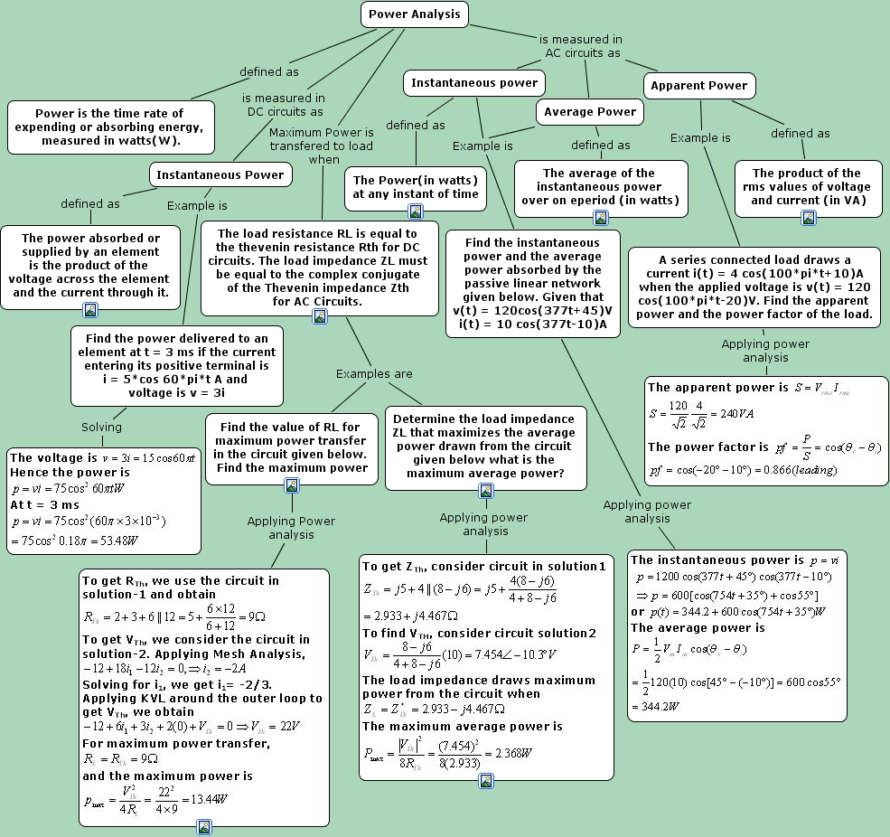 Power Analysis, The load resistance RL is equal to the thevenin resistance Rth for DC circuits. The load impedance ZL must be equal to the complex conjugate of the Thevenin impedance Zth for AC Circuits. Examples are Find the value of RL for maximum power transfer in the circuit given below. Find the maximum power, Find the instantaneous power and the average power absorbed by the passive linear network given below. Given that v(t) = 120cos(377t+45)V i(t) = 10 cos(377t-10)A Applying power analysis , Power Analysis Maximum Power is transfered to load when The load resistance RL is equal to the thevenin resistance Rth for DC circuits. The load impedance ZL must be equal to the complex conjugate of the Thevenin impedance Zth for AC Circuits., Instantaneous power Example is Find the instantaneous power and the average power absorbed by the passive linear network given below. Given that v(t) = 120cos(377t+45)V i(t) = 10 cos(377t-10)A, Find the value of RL for maximum power transfer in the circuit given below. Find the maximum power Applying Power analysis , Power Analysis is measured in AC circuits as Apparent Power, Power Analysis is measured in AC circuits as Apparent Power, Power Analysis is measured in AC circuits as Average Power, Find the power delivered to an element at t = 3 ms if the current entering its positive terminal is i = 5*cos 60*pi*t A and voltage is v = 3i Solving , Power Analysis defined as Power is the time rate of expending or absorbing energy, measured in watts(W).