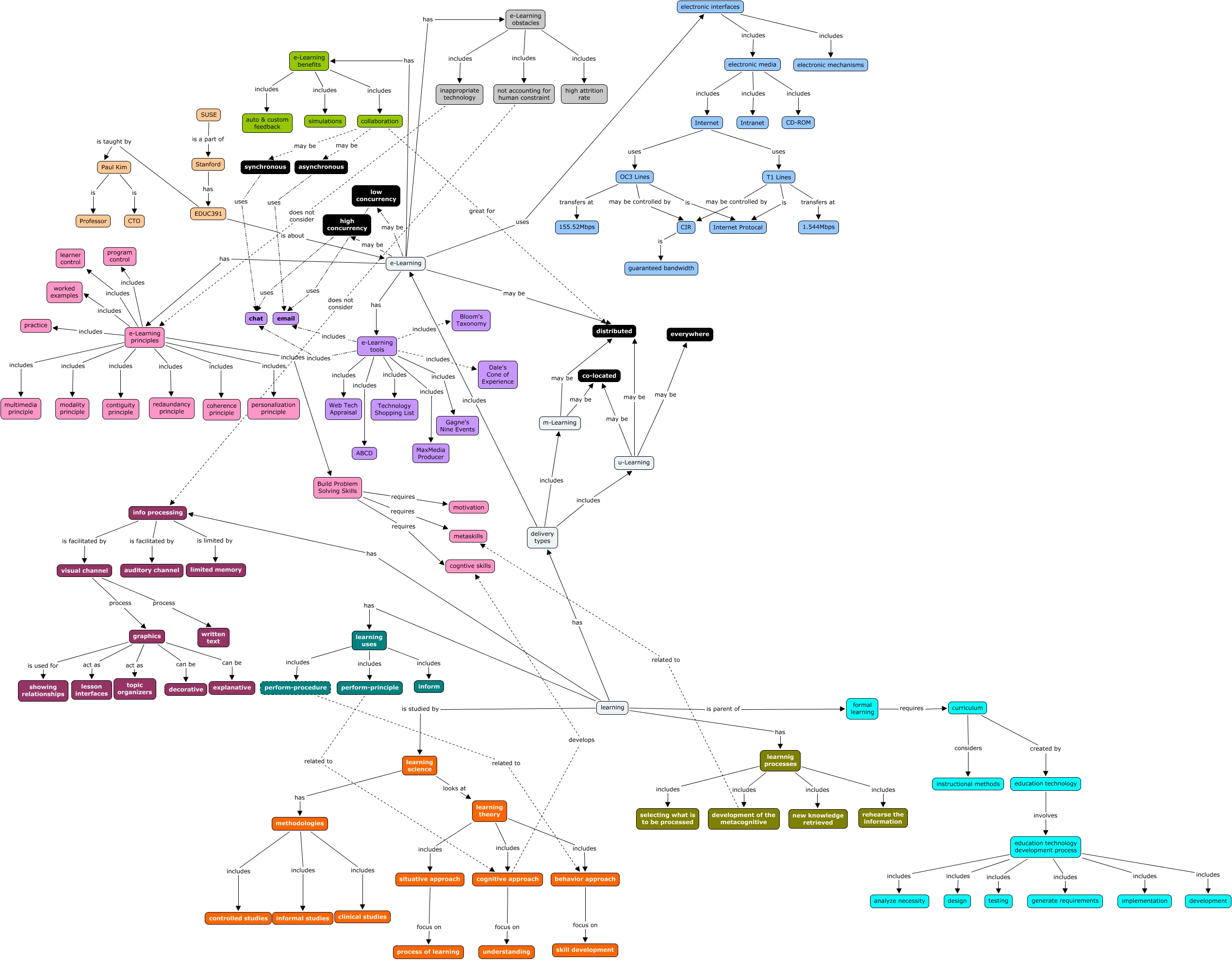 Cette carte de concepts créée avec IHMC CmapTools traite de: David Tu, graphics can be explanative, e-Learning obstacles includes inappropriate technology, Internet uses OC3 Lines, graphics act as topic organizers, e-Learning tools includes chat, e-Learning principles includes learner control, learnnig processes includes development of the metacognitive, education technology development process includes testing, education technology development process includes analyze necessity, learning science has methodologies, methodologies includes informal studies, Build Problem Solving Skills requires motivation, e-Learning has e-Learning tools, education technology development process includes implementation, e-Learning principles includes contiguity principle, e-Learning has e-Learning principles, e-Learning obstacles includes not accounting for human constraint, info processing is facilitated by auditory channel, Build Problem Solving Skills requires cogntive skills, learning has learnnig processes