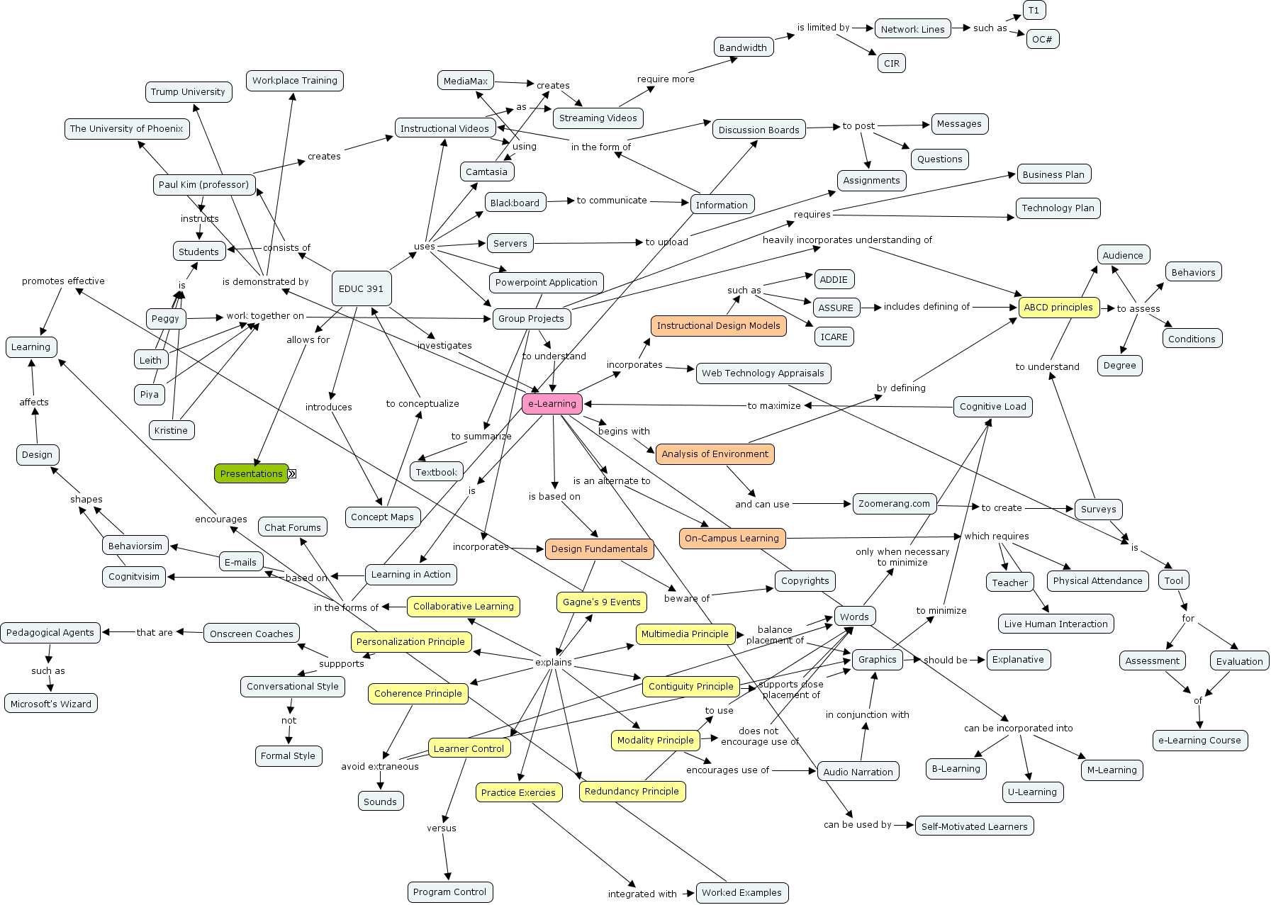 Peggy Chung, Audio Narration in conjunction with Graphics, Group Projects heavily incorporates understanding of ABCD principles, e-Learning is an alternate to On-Campus Learning, EDUC 391 consists of Students, Discussion Boards to post Questions, ABCD principles to assess Degree, e-Learning incorporates Web Technology Appraisals, e-Learning begins with Analysis of Environment, Redundancy Principle to use Words, e-Learning can be incorporated into U-Learning