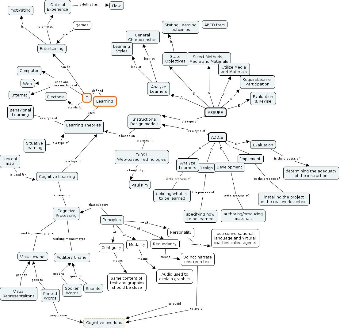 dahwunkim6, Audio used to explain graphics to avoid Cognitive overload, ASSURE U Utilize Media and Materials, ADDIE D Development, E defined Learning, ASSURE S Select Methods, Media and Materials, Ed391 Web-based Technologies is taught by Paul Kim, Principles of Personality, Cognitive Learning is based on Cognitive Processing, Behaviorial Learning is a type of Learning Theories, ASSURE R RequireLearner Participation