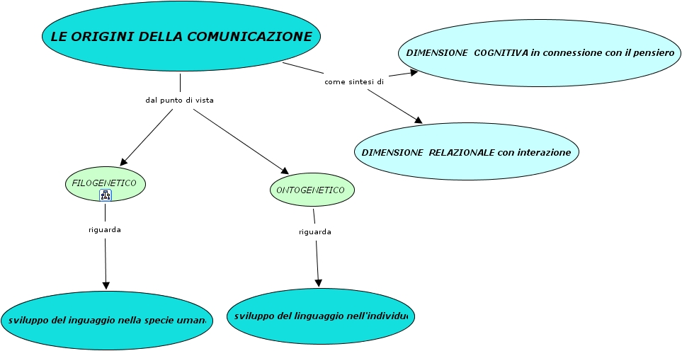 L'origine del linguaggio, FILOGENETICO riguarda sviluppo del inguaggio nella specie umana, LE ORIGINI DELLA COMUNICAZIONE dal punto di vista ONTOGENETICO, LE ORIGINI DELLA COMUNICAZIONE come sintesi di DIMENSIONE COGNITIVA in connessione con il pensiero, LE ORIGINI DELLA COMUNICAZIONE come sintesi di DIMENSIONE RELAZIONALE con interazione, LE ORIGINI DELLA COMUNICAZIONE dal punto di vista FILOGENETICO, ONTOGENETICO riguarda sviluppo del linguaggio nell'individuo