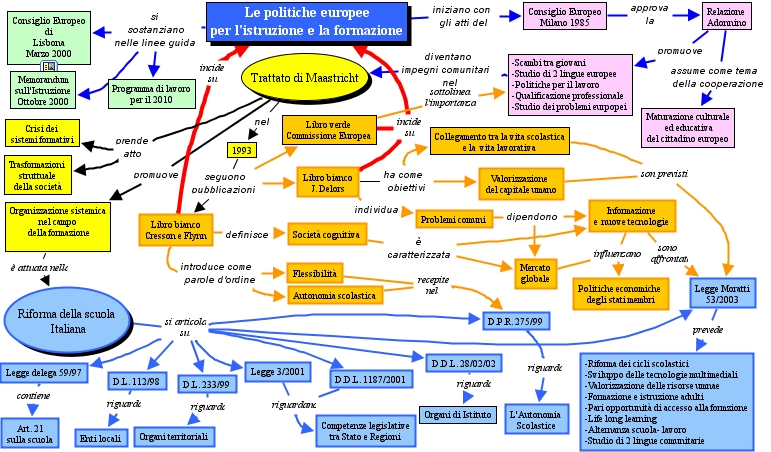 politiche europee, Libro bianco J. Delors ha come obiettivi Collegamento tra la vita scolastica e la vita lavorativa, Autonomia scolastica recepite nel D.P.R. 275/99, Libro bianco J. Delors ha come obiettivi Valorizzazione del capitale umano, Riforma della scuola Italiana si articola su D.P.R. 275/99, Libro bianco J. Delors incide su Le politiche europee per l'istruzione e la formazione, Collegamento tra la vita scolastica e la vita lavorativa son previsti Legge Moratti 53/2003, Problemi comuni dipendono Informazione e nuove tecnologie, Libro verde Commissione Europea incide su Le politiche europee per l'istruzione e la formazione, Riforma della scuola Italiana si articola su D.L. 233/99, 1993 seguono pubblicazioni Libro verde Commissione Europea