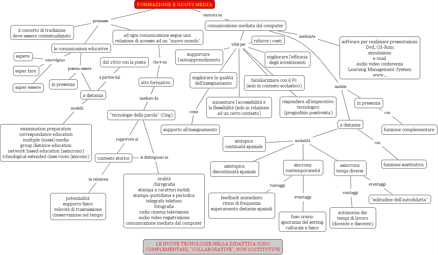 Formazione_nuovi_media, a distanza a partire dal dal 1800 con la posta, le comunicazioni educative possono essere in presenza, a distanza modalità asintopica discontinuità spaziale, ad ogni comunicazione segue una relazione di accesso ad un "nuovo mondo" che è un atto formativo, comunicazione mediata dal computer usabile a distanza, le comunicazioni educative coinvolgono saper essere, asincrona tempi diversi svantaggi "solitudine dell'autodidatta", FORMAZIONE E NUOVI MEDIA premesse ad ogni comunicazione segue una relazione di accesso ad un "nuovo mondo", sincrona contemporaneità svantaggi fuso orario ignoranza del setting culturale e fisico, comunicazione mediata dal computer utile per familiarizzare con il Pc (solo in contesto scolastico)