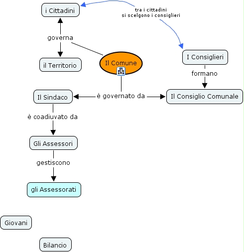 il Comune, Il Comune governa il Territorio, Il Comune governa i Cittadini, Il Sindaco è coadiuvato da Gli Assessori, Il Comune è governato da Il Consiglio Comunale, I Consiglieri formano Il Consiglio Comunale, Gli Assessori gestiscono gli Assessorati, Il Comune è governato da Il Sindaco