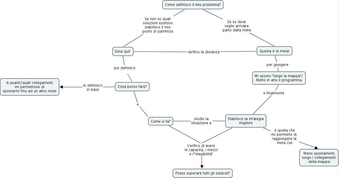 Perchè, Come definisco il mio problema? Se so dove voglio arrivare parto dalla meta Questa è la meta!, Cosa posso fare? e Come si fa?, Sono qui! poi definisco Cosa posso fare?, Questa è la meta! verifico la distanza Sono qui!, Come definisco il mio problema? Se non so quali soluzioni esistono stabilisco il mio punto di partenza Sono qui!, Stabilisco la strategia migliore e finalmente Mi sposto "lungo la mappa"/ Metto in atto il programma, Come si fa? Verifico di avere le capacità, i mezzi e l'"elegibilità" Posso superare tutti gli ostacoli?, Stabilisco la strategia migliore Verifico di avere le capacità, i mezzi e l'"elegibilità" Posso superare tutti gli ostacoli?, Cosa posso fare? lo definisco in base A quanti/quali collegamenti mi permettono di spostarmi fino ad un altro nodo, Come si fa? studio la situazione e Stabilisco la strategia migliore