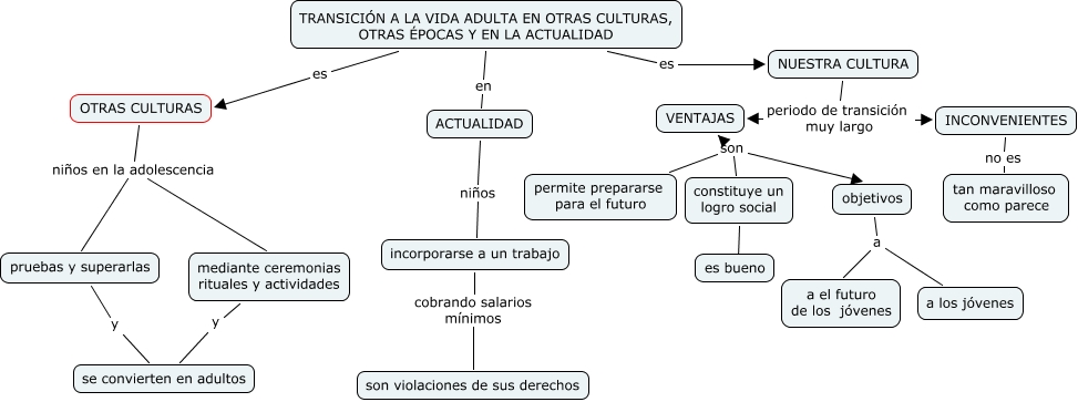 paula punto 2, constituye un logro social ???? es bueno, NUESTRA CULTURA periodo de transición muy largo INCONVENIENTES, mediante ceremonias rituales y actividades y se convierten en adultos, INCONVENIENTES no es tan maravilloso como parece, VENTAJAS son constituye un logro social, incorporarse a un trabajo cobrando salarios mínimos son violaciones de sus derechos, objetivos a a los jóvenes, OTRAS CULTURAS niños en la adolescencia pruebas y superarlas, VENTAJAS son objetivos, NUESTRA CULTURA periodo de transición muy largo VENTAJAS