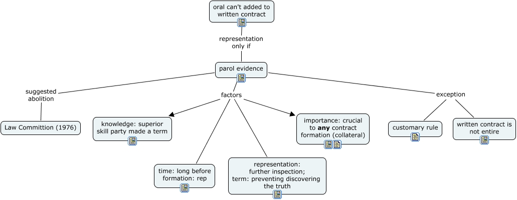 parol evidence, parol evidence exception customary rule, parol evidence factors time: long before formation: rep, parol evidence factors representation: further inspection; term: preventing discovering the truth, parol evidence factors knowledge: superior skill party made a term, oral can't added to written contract representation only if parol evidence, parol evidence exception written contract is not entire, parol evidence suggested abolition Law Committion (1976), parol evidence factors importance: crucial to any contract formation (collateral)