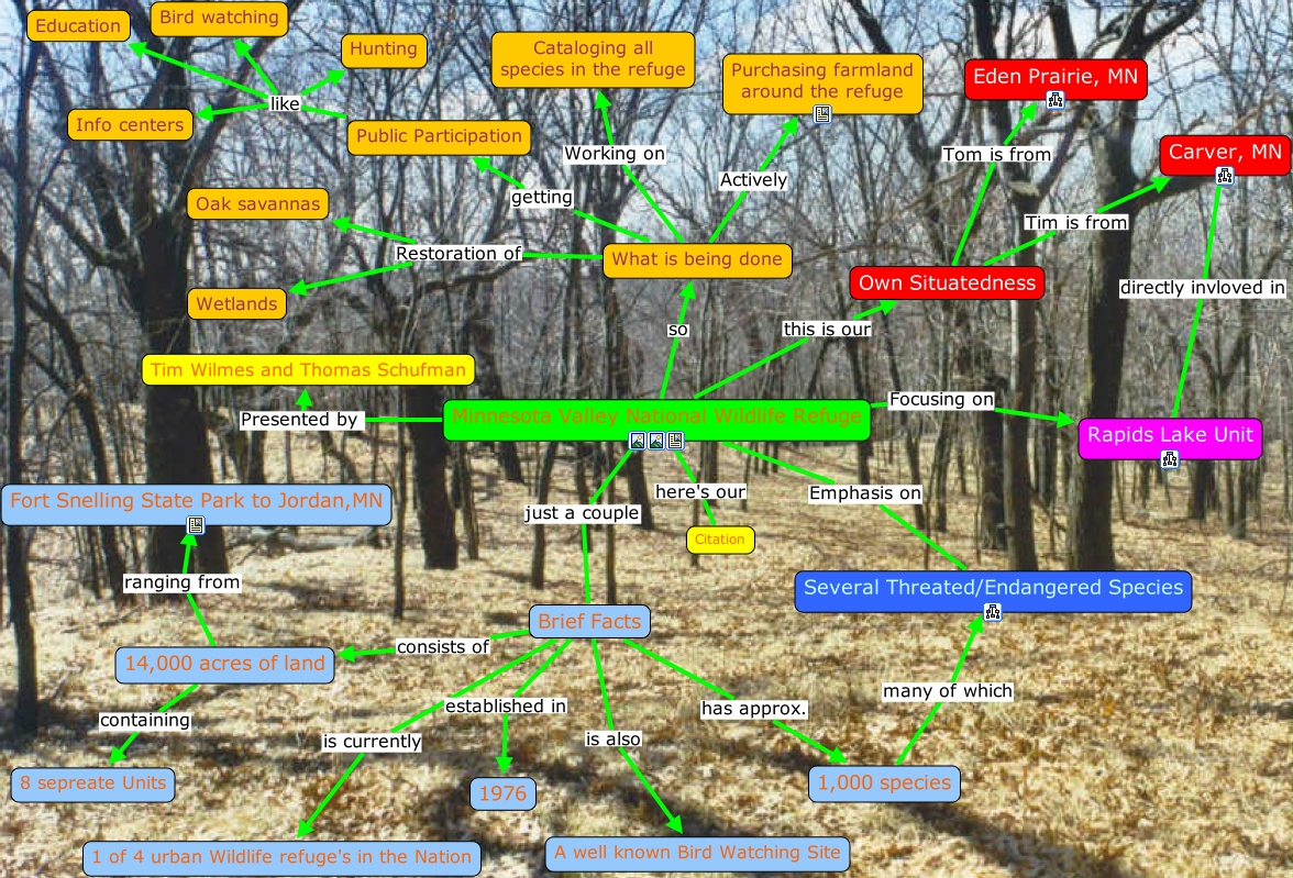 Minnesota Valley Tim and Tom, Minnesota Valley National Wildlife Refuge Emphasis on Several Threated/Endangered Species, What is being done Restoration of Oak savannas, Minnesota Valley National Wildlife Refuge so What is being done, Public Participation like Bird watching, Brief Facts is also A well known Bird Watching Site, Public Participation like Education, 14,000 acres of land ranging from Fort Snelling State Park to Jordan,MN, 14,000 acres of land containing 8 sepreate Units, Brief Facts established in 1976, Minnesota Valley National Wildlife Refuge just a couple Brief Facts