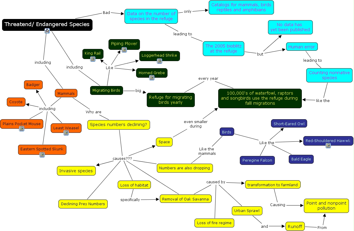 Threatend and Endangered, Mammals including Badger, Human error leading to Counting nonnative species, Migrating Birds Like King Rail, Removal of Oak Savanna caused by Urban Sprawl, Urban Sprawl and Runoff, Data on the number of species in the refuge only Catalogs for mammals, birds reptiles and amphibians, Birds Like the mammals Numbers are also dropping, Mammals including Eastern Spotted Skunk, Species numbers declining? causes??? Invasive species, Mammals Why are Species numbers declining?
