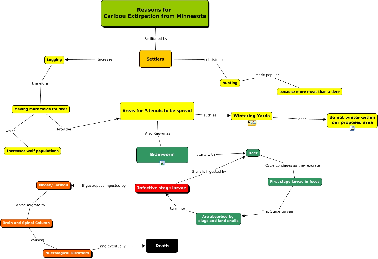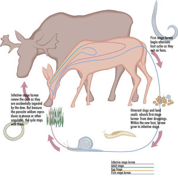 Caribou extirpation, Moose/Caribou Larvae migrate to Brain and Spinal Column, Wintering Yards deer do not winter within our proposed area, First stage larvae in feces First Stage Larvae Are absorbed by slugs and land snails, Areas for P.tenuis to be spread such as Wintering Yards, Reasons for Caribou Extirpation from Minnesota Facilitated by Settlers, Areas for P.tenuis to be spread Also Known as Brainworm, Infective stage larvae If snails ingested by Deer, hunting made popular because more meat than a deer, Infective stage larvae If gastropods ingested by Moose/Caribou, Logging therefore Making more fields for deer