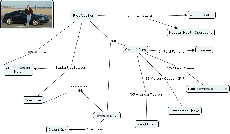 Fred Voelker's Information Page, Fred Voelker Likes to draw Graphic Design Major, Owns 4 Cars '88 Mercury Cougar XR-7 First car/ still have, Fred Voelker Car nut Owns 4 Cars, Fred Voelker Computer Operator Medstar Health Operations, Owns 4 Cars '76 Chevy Camaro Family owned since new, Owns 4 Cars '05 Hyundai Tiburon Bought new, Fred Voelker Student at Towson Commuter, Fred Voelker Computer Operator Unappreciated, Owns 4 Cars '64 Ford Fairlane Freebee, Loves to Drive Road Trips Ocean City