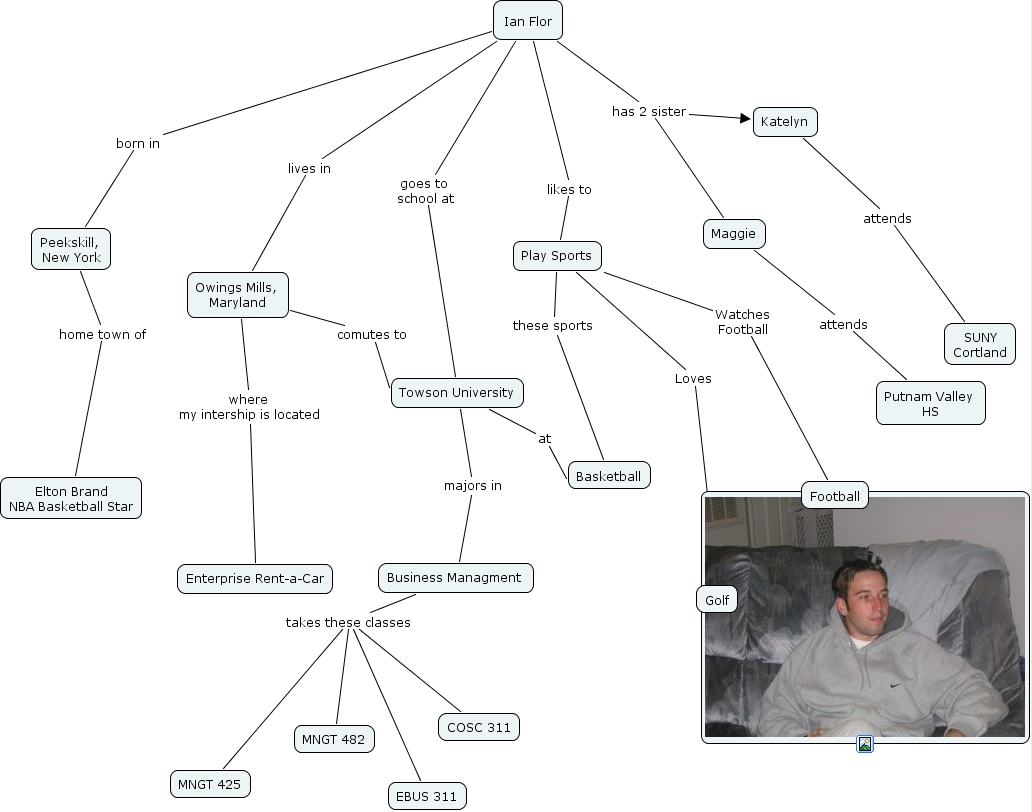Ian's Concept Map, Business Managment takes these classes EBUS 311, Ian Flor likes to Play Sports, Katelyn attends SUNY Cortland, Business Managment takes these classes COSC 311, Towson University at Basketball, Play Sports these sports Basketball, Play Sports Loves Golf, Towson University majors in Business Managment, Owings Mills, Maryland comutes to Towson University, Play Sports Watches Football Football
