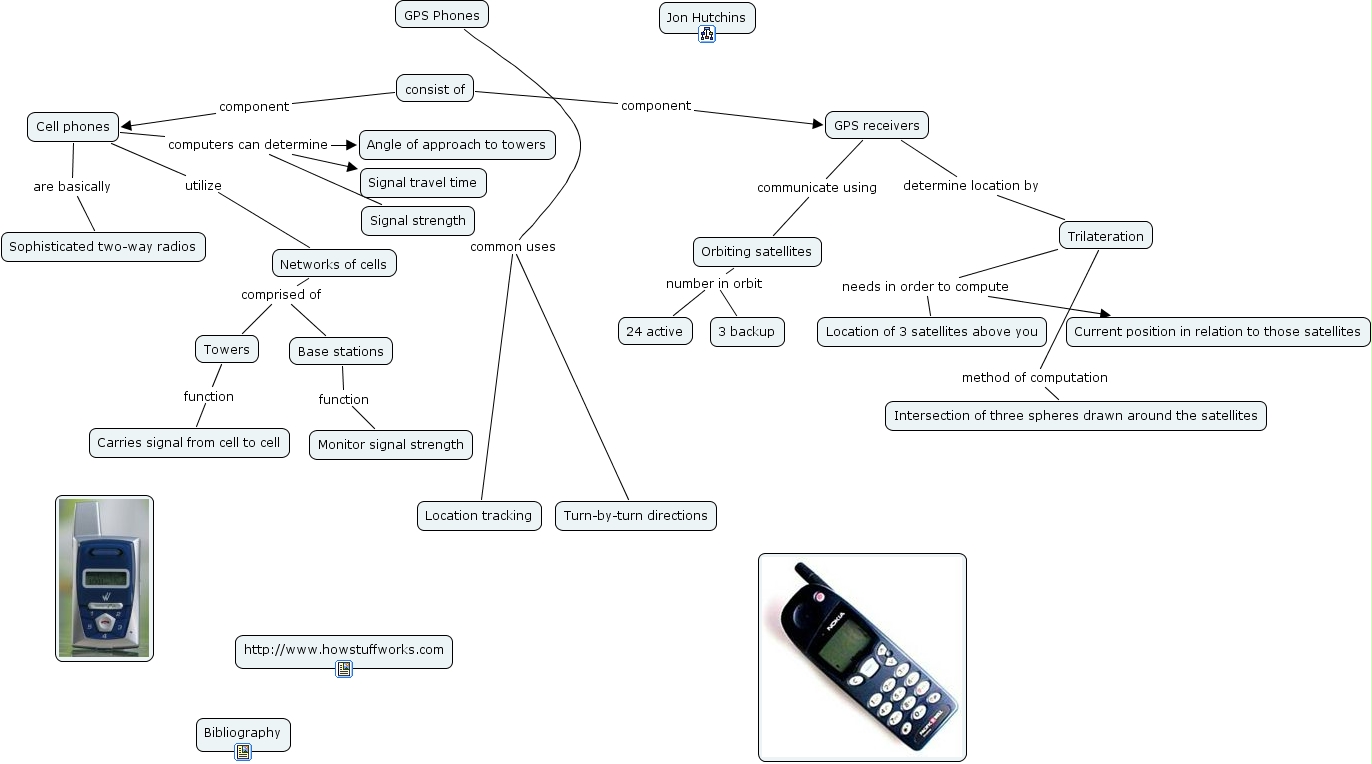 GPS Phone Concept Map, Trilateration method of computation Intersection of three spheres drawn around the satellites, Towers function Carries signal from cell to cell, GPS receivers communicate using Orbiting satellites, GPS receivers determine location by Trilateration, Cell phones computers can determine Signal strength, consist of component GPS receivers, consist of component Cell phones, Networks of cells comprised of Base stations, Trilateration needs in order to compute Location of 3 satellites above you, Cell phones computers can determine Angle of approach to towers