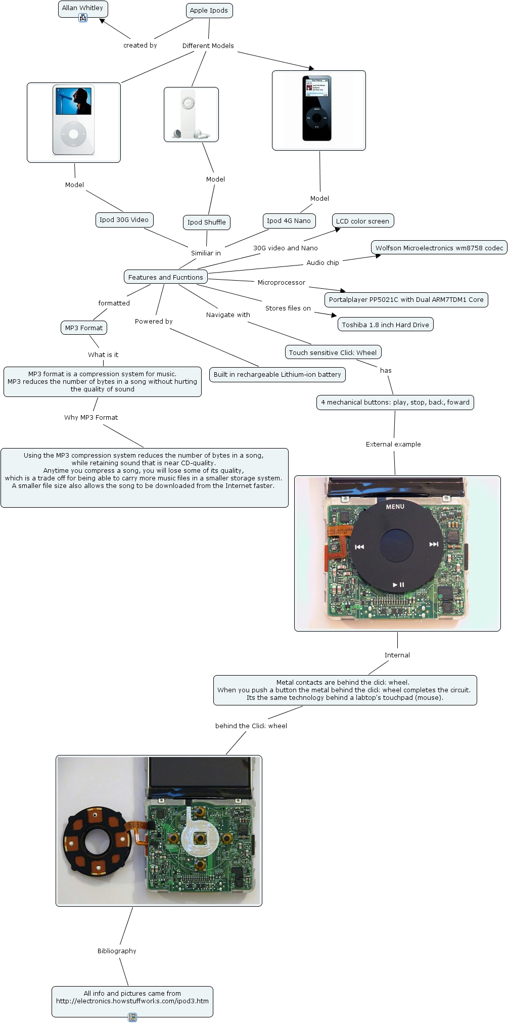 How Ipods Work- Allan Whitley, 4 mechanical buttons: play, stop, back, foward External example , Touch sensitive Click Wheel has 4 mechanical buttons: play, stop, back, foward, Apple Ipods Different Models , Apple Ipods Different Models , MP3 Format What is it MP3 format is a compression system for music. MP3 reduces the number of bytes in a song without hurting the quality of sound, Model Ipod 30G Video, Bibliography All info and pictures came from http://electronics.howstuffworks.com/ipod3.htm, MP3 format is a compression system for music. MP3 reduces the number of bytes in a song without hurting the quality of sound Why MP3 Format Using the MP3 compression system reduces the number of bytes in a song, while retaining sound that is near CD-quality. Anytime you compress a song, you will lose some of its quality, which is a trade off for being able to carry more music files in a smaller storage system. A smaller file size also allows the song to be downloaded from the Internet faster., Features and Fucntions Navigate with Touch sensitive Click Wheel, Ipod 30G Video Similiar in Features and Fucntions