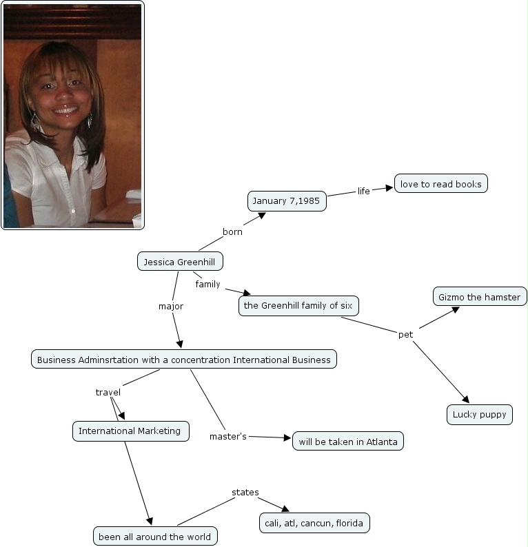 jessica, Business Adminsrtation with a concentration International Business master's will be taken in Atlanta, been all around the world states cali, atl, cancun, florida, January 7,1985 life love to read books, the Greenhill family of six pet Lucky puppy, the Greenhill family of six pet Gizmo the hamster, Business Adminsrtation with a concentration International Business travel International Marketing, Jessica Greenhill major Business Adminsrtation with a concentration International Business, Jessica Greenhill born January 7,1985, Business Adminsrtation with a concentration International Business travel been all around the world, Jessica Greenhill family the Greenhill family of six