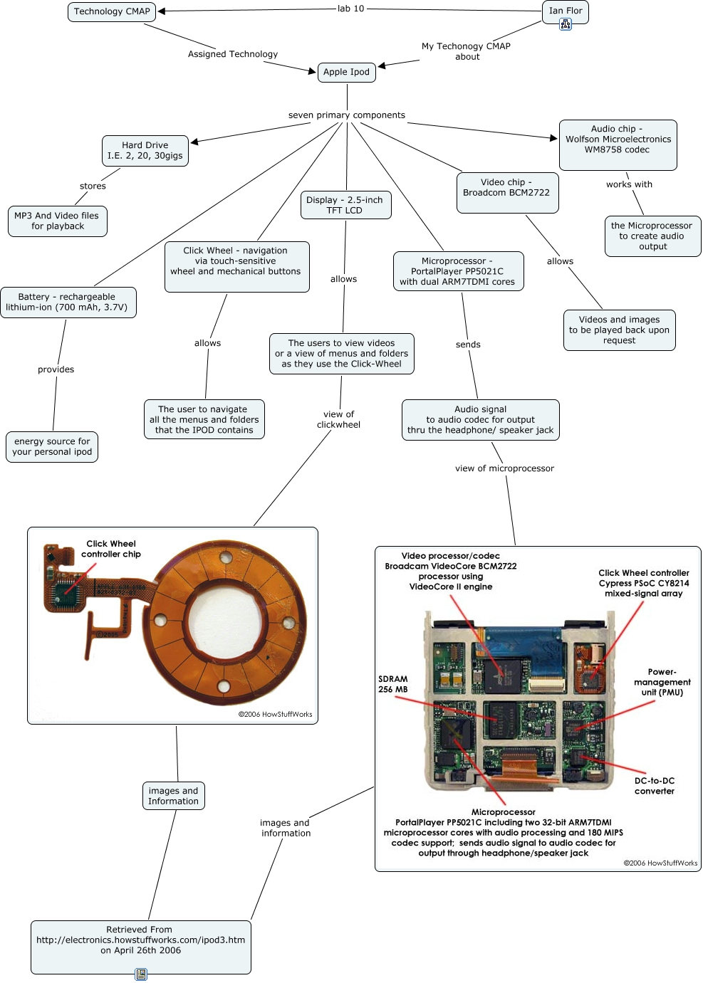 This Concept Map, created with IHMC CmapTools, has information related to: Technology CMAP, Ian Flor My Techonogy CMAP about Apple Ipod, Apple Ipod seven primary components Microprocessor - PortalPlayer PP5021C with dual ARM7TDMI cores, Display - 2.5-inch TFT LCD allows The users to view videos or a view of menus and folders as they use the Click-Wheel, The users to view videos or a view of menus and folders as they use the Click-Wheel view of clickwheel, Apple Ipod seven primary components Audio chip - Wolfson Microelectronics WM8758 codec, Video chip - Broadcom BCM2722 allows Videos and images to be played back upon request, Apple Ipod seven primary components Battery - rechargeable lithium-ion (700 mAh, 3.7V), Apple Ipod seven primary components Video chip - Broadcom BCM2722, Audio signal to audio codec for output thru the headphone/ speaker jack view of microprocessor, Apple Ipod seven primary components Hard Drive I.E. 2, 20, 30gigs, Audio chip - Wolfson Microelectronics WM8758 codec works with the Microprocessor to create audio output, Battery - rechargeable lithium-ion (700 mAh, 3.7V) provides energy source for your personal ipod, Apple Ipod seven primary components Display - 2.5-inch TFT LCD, Microprocessor - PortalPlayer PP5021C with dual ARM7TDMI cores sends Audio signal to audio codec for output thru the headphone/ speaker jack, Click Wheel - navigation via touch-sensitive wheel and mechanical buttons allows The user to navigate all the menus and folders that the IPOD contains, Hard Drive I.E. 2, 20, 30gigs stores MP3 And Video files for playback, Apple Ipod seven primary components Click Wheel - navigation via touch-sensitive wheel and mechanical buttons, Ian Flor lab 10 Technology CMAP, ???? Retrieved From http://electronics.howstuffworks.com/ipod3.htm on April 26th 2006, images and information Retrieved From http://electronics.howstuffworks.com/ipod3.htm on April 26th 2006