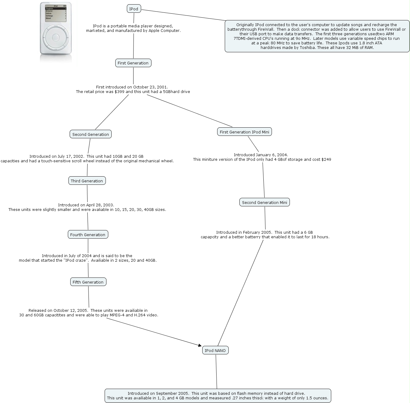 Tmoore2IPod, First Generation First introduced on October 23, 2001. The retail price was $399 and this unit had a 5GBhard drive First Generation IPod Mini, First Generation IPod Mini Introduced January 6, 2004. This miniture version of the IPod only had 4 GBof storage and cost $249 Second Generation Mini, First Generation First introduced on October 23, 2001. The retail price was $399 and this unit had a 5GBhard drive Second Generation, IPod NANO ???? Introduced on September 2005. This unit was based on flash memory instead of hard drive. This unit was availiable in 1, 2, and 4 GB models and measeured .27 inches thisck with a weight of only 1.5 ounces., Fifth Generation Released on October 12, 2005. These units were availiable in 30 and 60GB capacitites and were able to play MPEG-4 and H.264 video. IPod NANO, IPod IPod is a portable media player designed, marketed, and manufactured by Apple Computer. First Generation, IPod ???? Originally IPod connected to the user's computer to update songs and recharge the batterythrough FireWall. Then a dock connector was added to allow users to use FireWall or their USB port to make data transfers. The first three generations usedtwo ARM 7TDMI-derived CPU's running at 9o MHz. Later models use variable speed chips to run at a peak 80 MHz to save battery life. These Ipods use 1.8 inch ATA harddrives made by Toshiba. These all have 32 MiB of RAM., Fourth Generation Introduced in July of 2004 and is said to be the model that started the "IPod craze". Availiable in 2 sizes, 20 and 40GB. Fifth Generation, Second Generation Mini Introduced in February 2005. This unit had a 6 GB capapcity and a better batterry that enabled it to last for 18 hours. , Second Generation Introduced on July 17, 2002. This unit had 10GB and 20 GB capacities and had a touch-sensitive scroll wheel instead of the original mechanical wheel. Third Generation