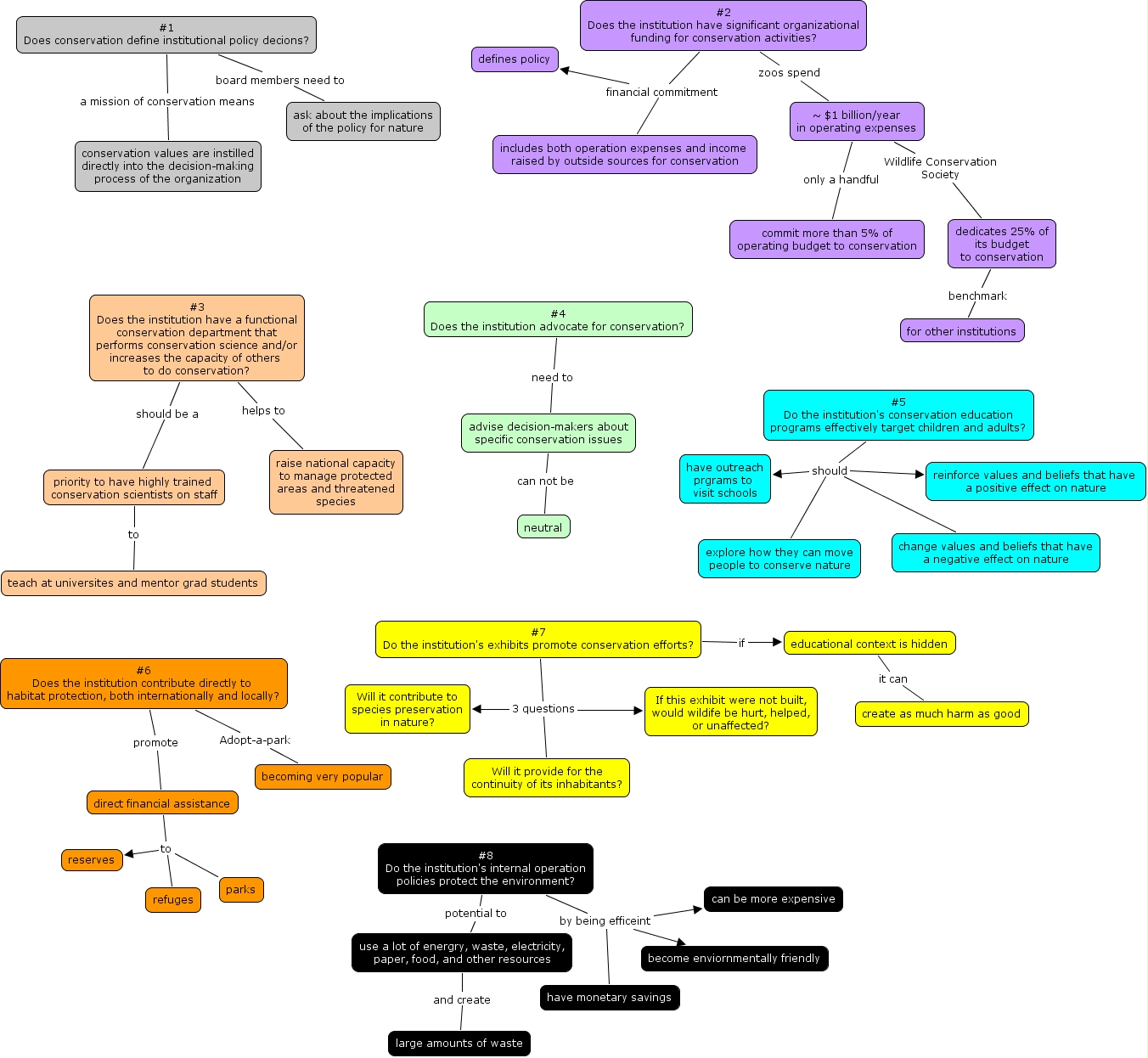 Eight questions, #7 Do the institution's exhibits promote conservation efforts? 3 questions Will it provide for the continuity of its inhabitants?, #6 Does the institution contribute directly to habitat protection, both internationally and locally? Adopt-a-park becoming very popular, direct financial assistance to refuges, #5 Do the institution's conservation education programs effectively target children and adults? should reinforce values and beliefs that have a positive effect on nature, #2 Does the institution have significant organizational funding for conservation activities? financial commitment includes both operation expenses and income raised by outside sources for conservation, #7 Do the institution's exhibits promote conservation efforts? 3 questions If this exhibit were not built, would wildife be hurt, helped, or unaffected?, #6 Does the institution contribute directly to habitat protection, both internationally and locally? promote direct financial assistance, educational context is hidden it can create as much harm as good, priority to have highly trained conservation scientists on staff to teach at universites and mentor grad students, #1 Does conservation define institutional policy decions? board members need to ask about the implications of the policy for nature