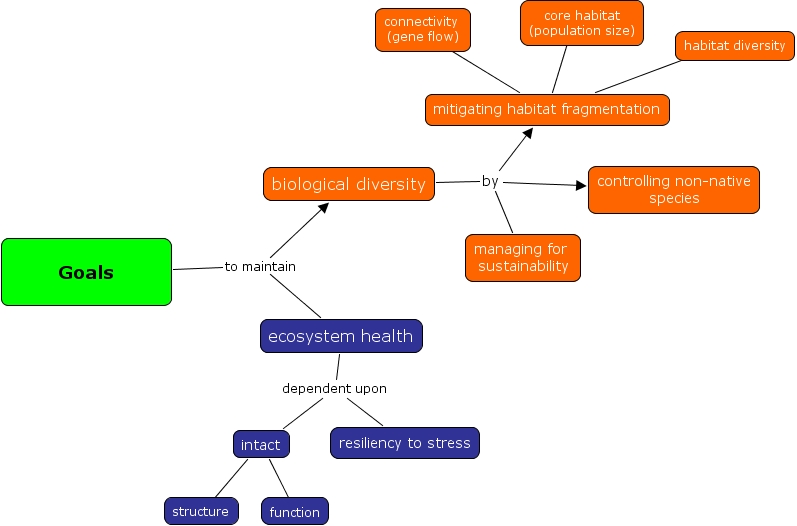 Conservation Bio 2, Goals to maintain biological diversity, mitigating habitat fragmentation ???? connectivity (gene flow), biological diversity by mitigating habitat fragmentation, Goals to maintain biological diversity, Goals to maintain ecosystem health, ecosystem health dependent upon intact, mitigating habitat fragmentation ???? habitat diversity, Goals to maintain ecosystem health, biological diversity by managing for sustainability, biological diversity by mitigating habitat fragmentation