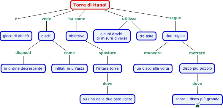 torre hanoi, Torre di Hanoi utilizza alcuni dischi di misura diversa, due regole muovere un disco alla volta, due regole mettere disco più piccolo, dischi come infilati in un'asta, Torre di Hanoi vede dischi, Torre di Hanoi ha come obiettivo, Torre di Hanoi utilizza tre aste, Torre di Hanoi è gioco di abilità, l'intera torre dove su una delle due aste libere, disco più piccolo dove sopra il disco più grande