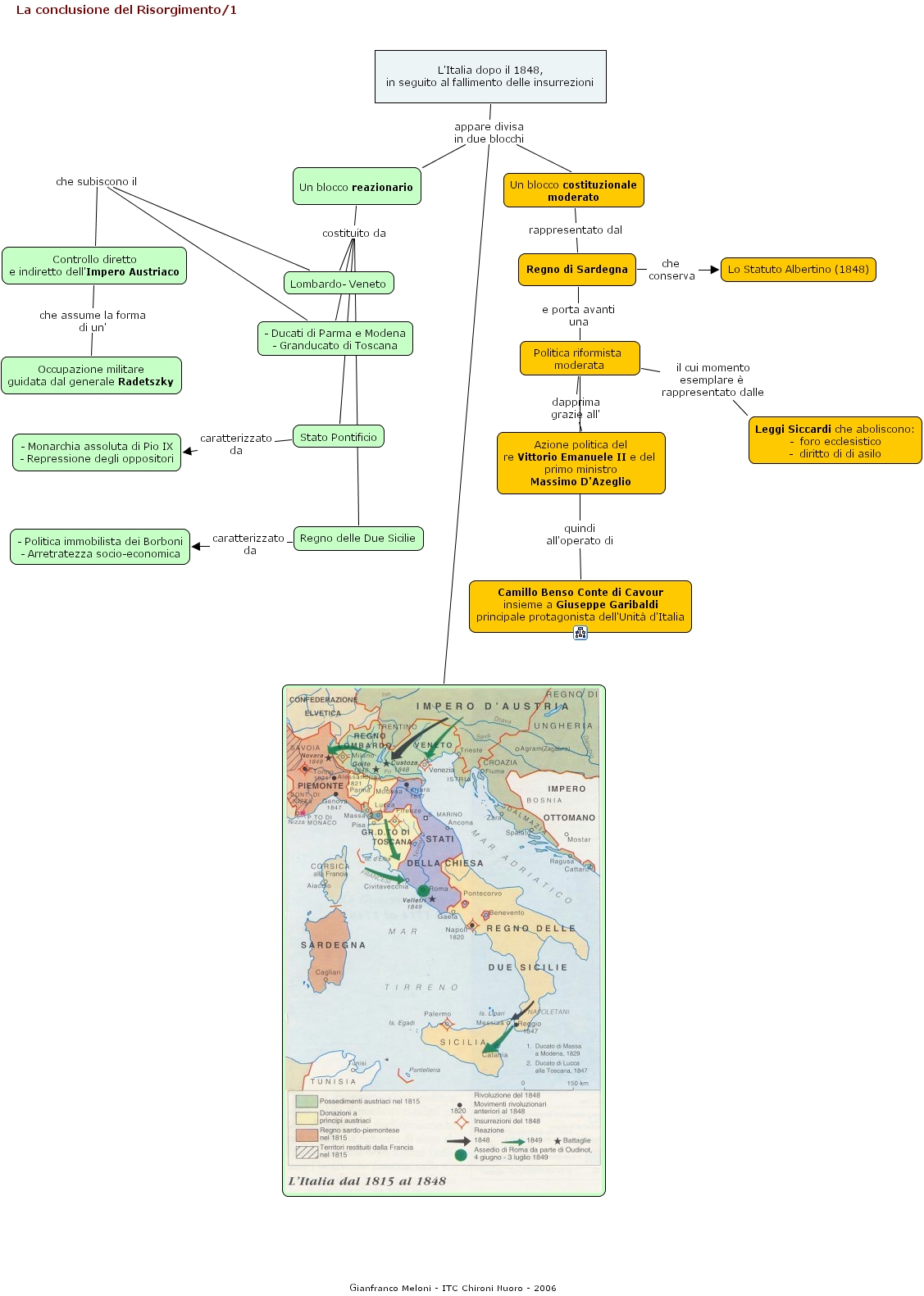 unificazione_italiana_1, L'Italia dopo il 1848, in seguito al fallimento delle insurrezioni appare divisa in due blocchi Un blocco reazionario, L'Italia dopo il 1848, in seguito al fallimento delle insurrezioni appare divisa in due blocchi , - Ducati di Parma e Modena - Granducato di Toscana che subiscono il Controllo diretto e indiretto dell'Impero Austriaco, Un blocco reazionario costituito da - Ducati di Parma e Modena - Granducato di Toscana, Politica riformista moderata dapprima grazie all' Azione politica del re Vittorio Emanuele II e del primo ministro Massimo D'Azeglio, Un blocco reazionario costituito da Regno delle Due Sicilie, Stato Pontificio caratterizzato da - Monarchia assoluta di Pio IX - Repressione degli oppositori, Un blocco reazionario costituito da Stato Pontificio, Politica riformista moderata quindi all'operato di Camillo Benso Conte di Cavour insieme a Giuseppe Garibaldi principale protagonista dell'Unità d'Italia, Un blocco costituzionale moderato rappresentato dal Regno di Sardegna