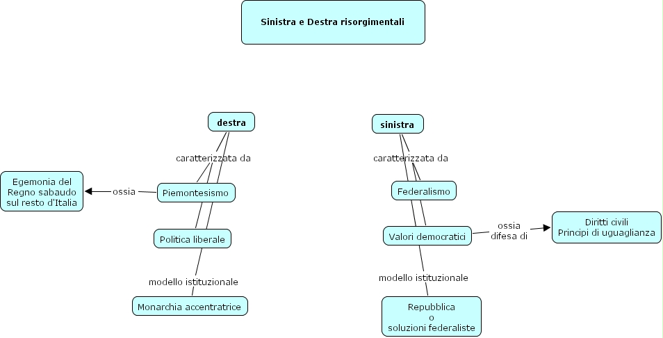 gruppo 2, Piemontesismo ossia Egemonia del Regno sabaudo sul resto d'Italia, Valori democratici ossia difesa di Diritti civili Principi di uguaglianza, destra modello istituzionale Monarchia accentratrice, sinistra modello istituzionale Repubblica o soluzioni federaliste, destra caratterizzata da Politica liberale, sinistra caratterizzata da Federalismo, destra caratterizzata da Piemontesismo, sinistra caratterizzata da Valori democratici