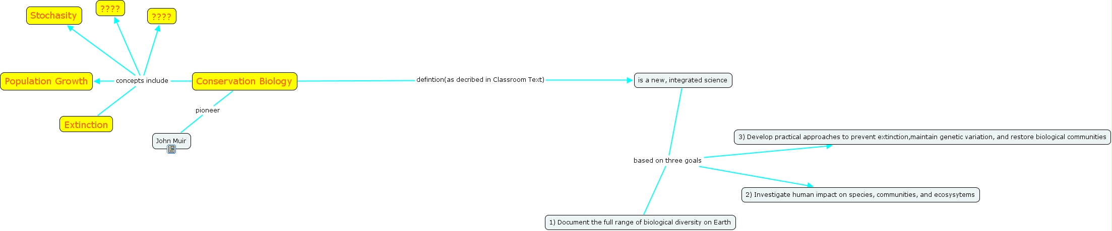 Final, is a new, integrated science based on three goals 1) Document the full range of biological diversity on Earth, Conservation Biology pioneer John Muir, is a new, integrated science based on three goals 3) Develop practical approaches to prevent extinction,maintain genetic variation, and restore biological communities, Conservation Biology concepts include Population Growth, Conservation Biology concepts include ????, Conservation Biology concepts include ????, is a new, integrated science based on three goals 2) Investigate human impact on species, communities, and ecosysytems, Conservation Biology concepts include Stochasity, Conservation Biology concepts include Extinction, Conservation Biology defintion(as decribed in Classroom Text) is a new, integrated science