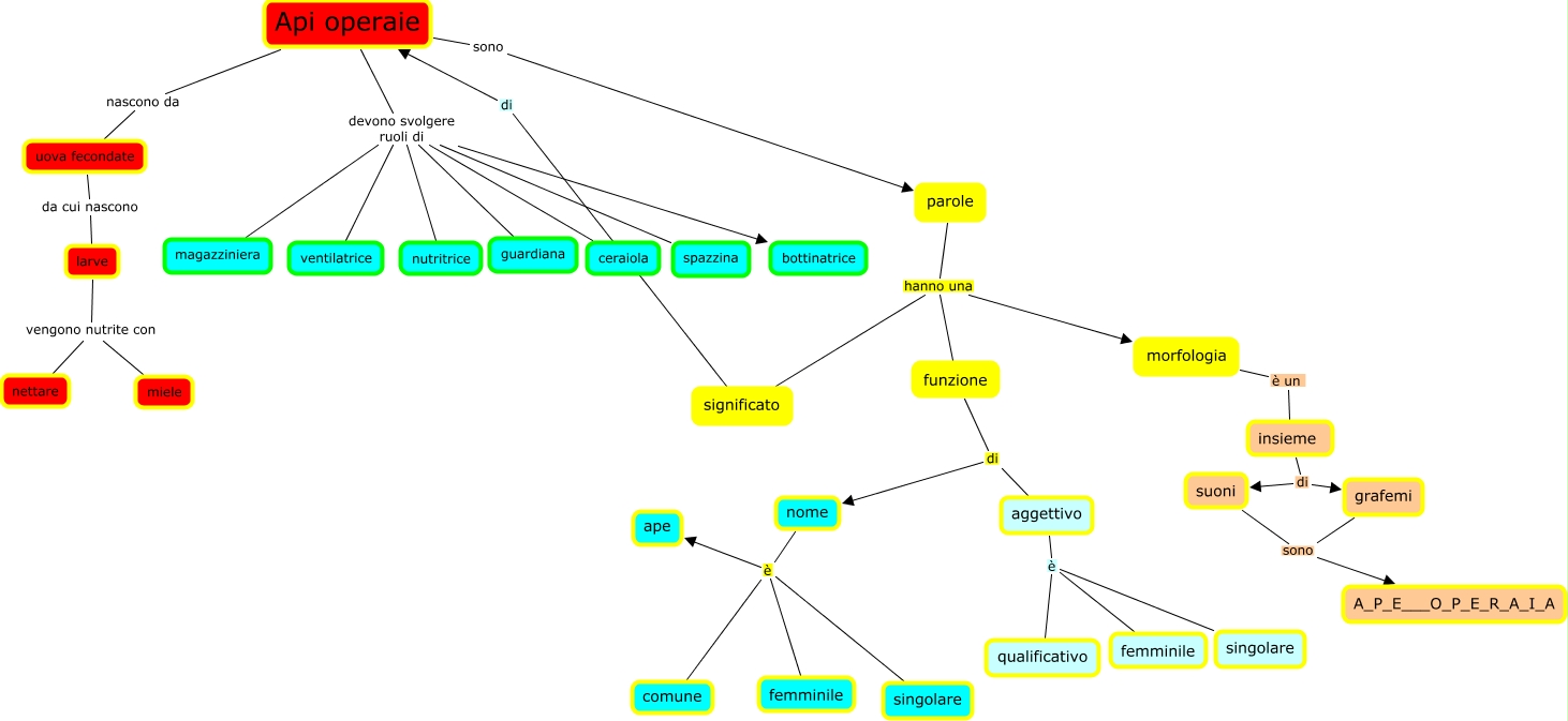ape operaia, nome è femminile, larve vengono nutrite con miele, Api operaie devono svolgere ruoli di ventilatrice, grafemi sono A_P_E___O_P_E_R_A_I_A, nome è ape, Api operaie nascono da uova fecondate, parole hanno una morfologia, suoni sono A_P_E___O_P_E_R_A_I_A, aggettivo è femminile, Api operaie devono svolgere ruoli di magazziniera