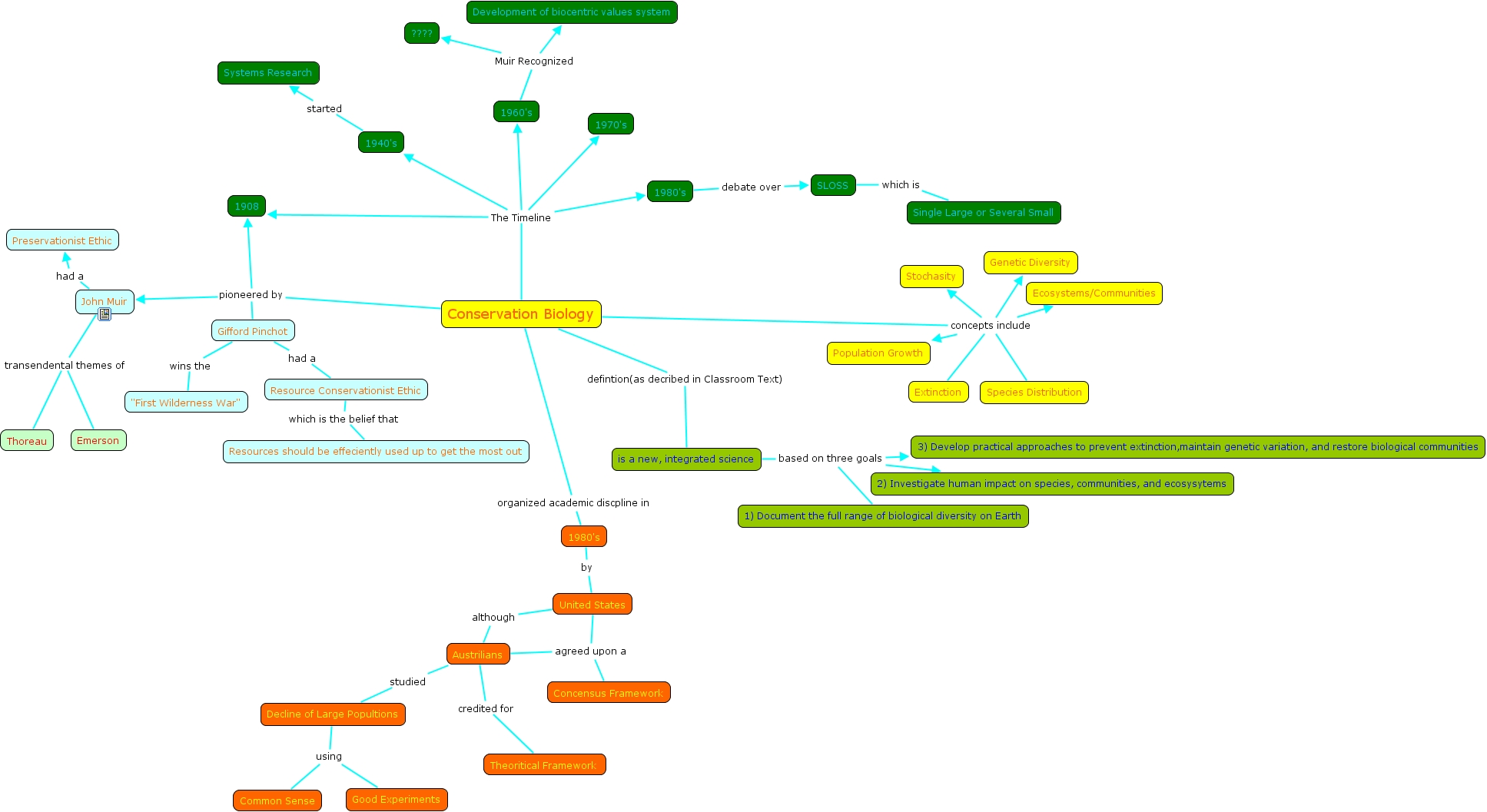 Final C-map 2, Conservation Biology concepts include Extinction, United States although Austrilians, Conservation Biology The Timeline 1908, Conservation Biology pioneered by Gifford Pinchot, Gifford Pinchot wins the "First Wilderness War", Conservation Biology organized academic discpline in 1980's, 1940's started Systems Research, 1980's debate over SLOSS, 1960's Muir Recognized Development of biocentric values system, Conservation Biology The Timeline 1970's
