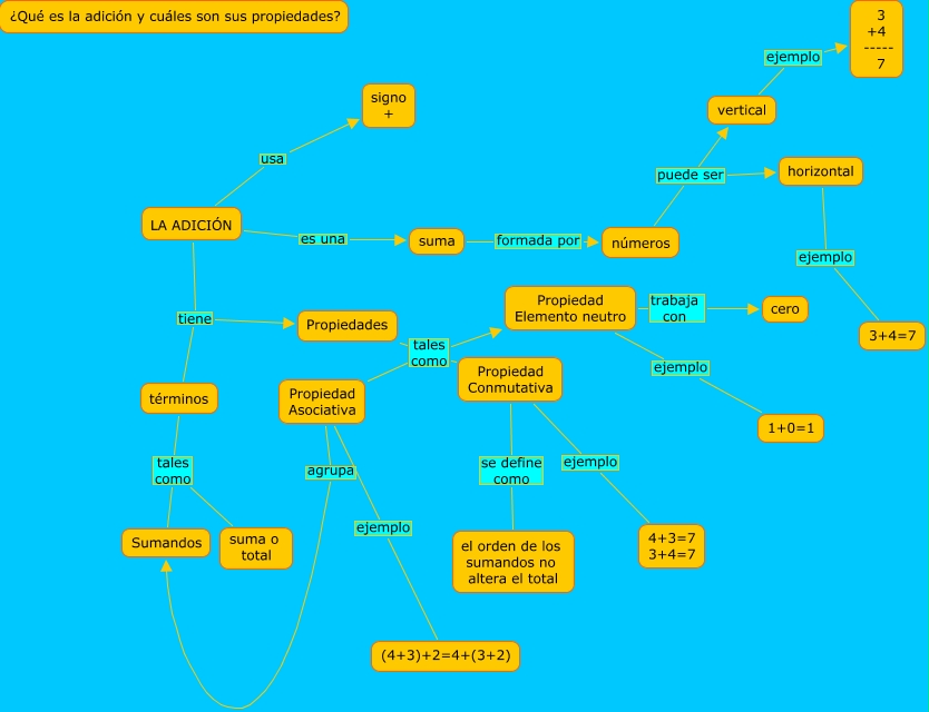 la adición, suma formada por números, Propiedad Conmutativa se define como el orden de los sumandos no altera el total, LA ADICIÓN usa signo +, números puede ser horizontal, LA ADICIÓN es una suma, Propiedad Elemento neutro trabaja con cero, Propiedad Elemento neutro ejemplo 1+0=1, Propiedades tales como Propiedad Conmutativa, Propiedad Asociativa agrupa Sumandos, números puede ser vertical