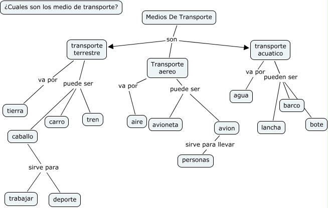 Los Medios De Transporte, Medios De Transporte son transporte terrestre, transporte acuatico pueden ser lancha, Transporte aereo va por aire, Transporte aereo puede ser avioneta, Medios De Transporte son transporte acuatico, avion sirve para llevar personas, transporte terrestre puede ser tren, transporte terrestre va por tierra, transporte acuatico pueden ser barco, caballo sirve para deporte