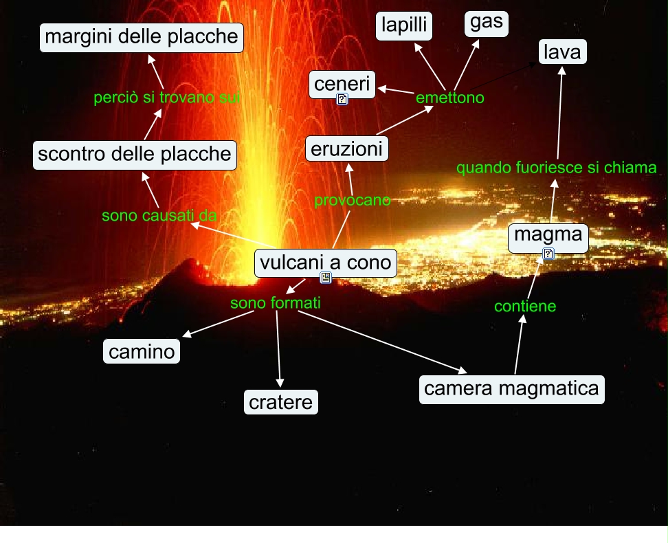 vulcani a cono, vulcani a cono sono formati cratere, eruzioni emettono gas, eruzioni emettono lava, eruzioni emettono lapilli, vulcani a cono sono causati da scontro delle placche, magma quando fuoriesce si chiama lava, scontro delle placche perciò si trovano sui margini delle placche, eruzioni emettono ceneri, vulcani a cono provocano eruzioni, vulcani a cono sono formati camino