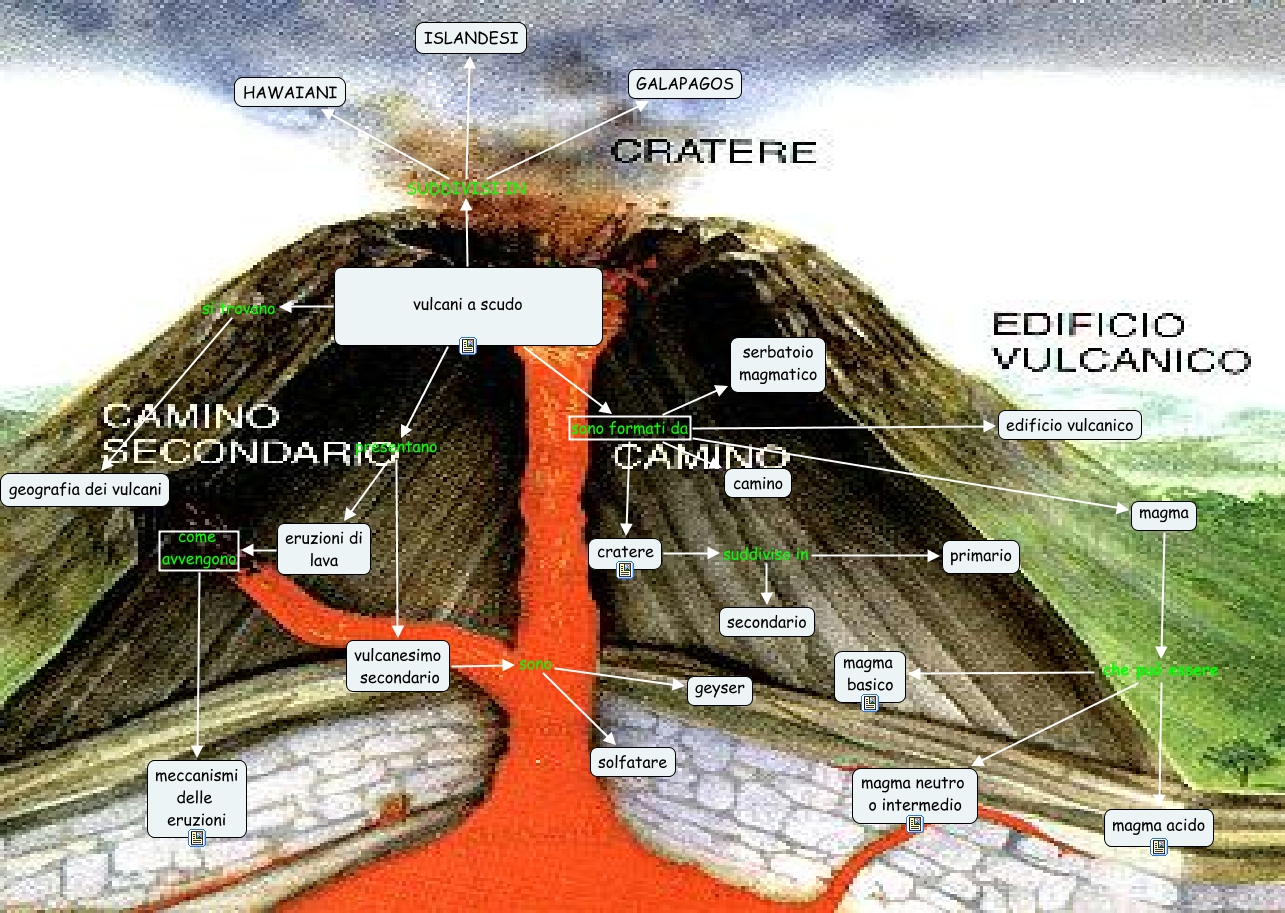 vulcani a scudo, cratere suddiviso in primario, vulcani a scudo sono formati da cratere, vulcani a scudo sono formati da magma, vulcanesimo secondario sono solfatare, magma che può essere magma basico, vulcani a scudo sono formati da edificio vulcanico, vulcani a scudo sono formati da camino, magma che può essere magma neutro o intermedio, vulcani a scudo presentano eruzioni di lava, cratere suddiviso in secondario