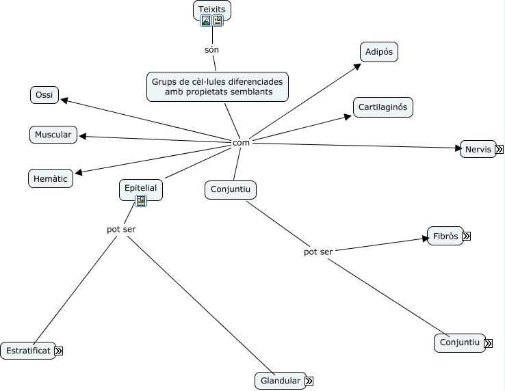 Teixits1, Gladular format per Cèl·lules cúbiques o prismàtiques, Cèl·lues agrupades: Glàndules poden ser Mixtes, Grups de cèl·lules diferenciades amb propietats semblants com Hemàtic, Conjuntiu pot ser Conjuntiu lax, Conjuntiu pot ser Fibròs, Neurones formades per Dendrites, Grups de cèl·lules diferenciades amb propietats semblants com Conjuntiu, Cèl·lues agrupades: Glàndules poden ser Endocrines, Cèl·lules cúbiques o prismàtiques poden ser Exocrines, Conjuntiu lax Les cèl·lules poden ser Melanòcits