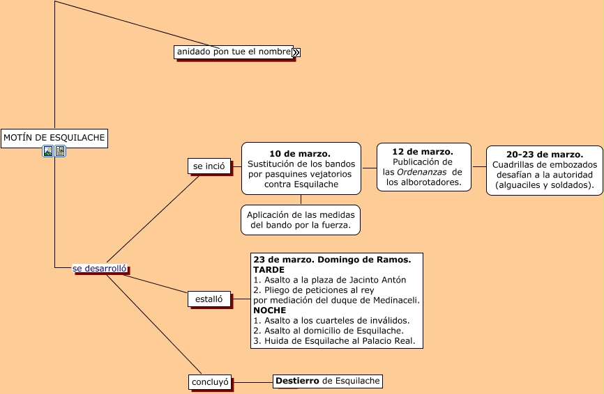 arrossego, concluyó ???? Destierro de Esquilache, MOTÍN DE ESQUILACHE se produjo por ????, concluyó ???? Destierro de Esquilache, estalló se desarrolló concluyó, 12 de marzo. Publicación de las Ordenanzas de los alborotadores. ???? 20-23 de marzo. Cuadrillas de embozados desafían a la autoridad (alguaciles y soldados)., 10 de marzo. Sustitución de los bandos por pasquines vejatorios contra Esquilache ???? 12 de marzo. Publicación de las Ordenanzas de los alborotadores., 2. El rechazo de los españoles a los ministros extranjeros de la corte de Carlos III se produjo por ????, MOTÍN DE ESQUILACHE se desarrolló concluyó, concluyó ???? Destierro de Esquilache, 10 de marzo. Sustitución de los bandos por pasquines vejatorios contra Esquilache ???? Aplicación de las medidas del bando por la fuerza.