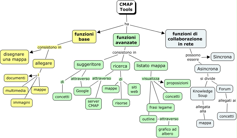 Copia di funzioni di Cmaptool, ricerca attraverso server CMAP, CMAP Tools ha funzioni base, funzioni avanzate consistono in listato mappa, funzioni di collaborazione in rete possono essere Sincrona, Forum allegati ai concetti, outline attraverso grafico ad albero, suggeritore attraverso Google, listato mappa visualizza concetti, ricerca di risorse, funzioni di collaborazione in rete possono essere Asincrona
