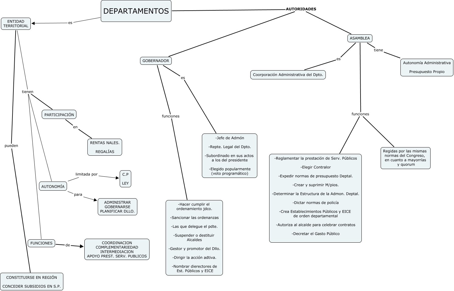 julianruiz reg Departamental, ASAMBLEA funciones -Reglamentar la prestación de Serv. Públicos -Elegir Contralor -Expedir normas de presupuesto Deptal. -Crear y suprimir M/pios. -Determinar la Estructura de la Admon. Deptal. -Dictar normas de policía -Crea Establecimientos Públicos y EICE de orden departamental -Autoriza al alcalde para celebrar contratos -Decretar el Gasto Público, GOBERNADOR funciones -Hacer cumplir el ordenamiento jdco. -Sancionar las ordenanzas -Las que delegue el pdte. -Suspender o destituir Alcaldes -Gestor y promotor del Dllo. -Dirigir la acción adtiva. -Nombrar dierectores de Est. Públicos y EICE, ENTIDAD TERRITORIAL tienen FUNCIONES, GOBERNADOR es -Jefe de Admón -Repte. Legal del Dpto. -Subordinado en sus actos a los del presidente -Elegido popularmente (voto programático), ASAMBLEA tiene Autonomía Administrativa Presupuesto Propio, DEPARTAMENTOS es ENTIDAD TERRITORIAL, DEPARTAMENTOS AUTORIDADES ASAMBLEA, ENTIDAD TERRITORIAL tienen PARTICIPACIÓN, FUNCIONES de COORDINACION COMPLEMENTARIEDAD INTERMEDIACION APOYO PREST. SERV. PUBLICOS, ENTIDAD TERRITORIAL pueden CONSTITUIRSE EN REGIÓN CONCEDER SUBSIDIOS EN S.P.