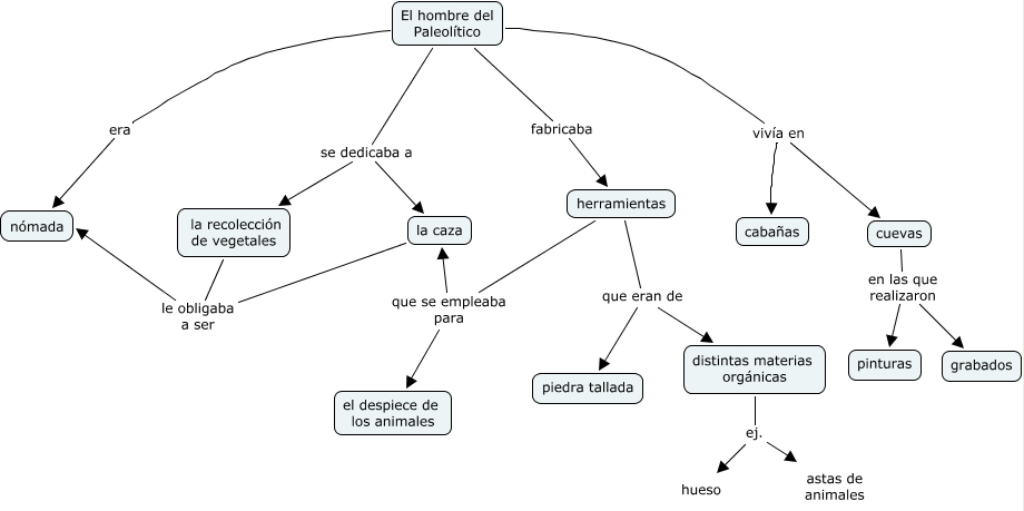 El Paleolítico, El hombre del Paleolítico fabricaba herramientas, herramientas que se empleaba para el despiece de los animales, El hombre del Paleolítico vivía en cuevas, El hombre del Paleolítico vivía en cabañas, cuevas en las que realizaron pinturas, cuevas en las que realizaron grabados, la recolección de vegetales le obligaba a ser nómada, El hombre del Paleolítico se dedicaba a la caza, herramientas que eran de distintas materias orgánicas, El hombre del Paleolítico se dedicaba a la recolección de vegetales