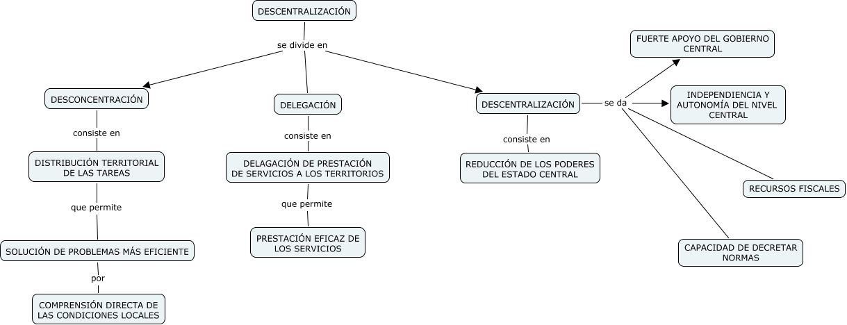 descentralizacion alexandra ospina, DESCENTRALIZACIÓN se divide en DELEGACIÓN, DESCENTRALIZACIÓN se da INDEPENDIENCIA Y AUTONOMÍA DEL NIVEL CENTRAL, SOLUCIÓN DE PROBLEMAS MÁS EFICIENTE por COMPRENSIÓN DIRECTA DE LAS CONDICIONES LOCALES, DESCENTRALIZACIÓN se da CAPACIDAD DE DECRETAR NORMAS, DESCENTRALIZACIÓN se divide en DESCONCENTRACIÓN, DESCENTRALIZACIÓN se da FUERTE APOYO DEL GOBIERNO CENTRAL, DELAGACIÓN DE PRESTACIÓN DE SERVICIOS A LOS TERRITORIOS que permite PRESTACIÓN EFICAZ DE LOS SERVICIOS, DELEGACIÓN consiste en DELAGACIÓN DE PRESTACIÓN DE SERVICIOS A LOS TERRITORIOS, DESCENTRALIZACIÓN consiste en REDUCCIÓN DE LOS PODERES DEL ESTADO CENTRAL, DESCENTRALIZACIÓN se da RECURSOS FISCALES