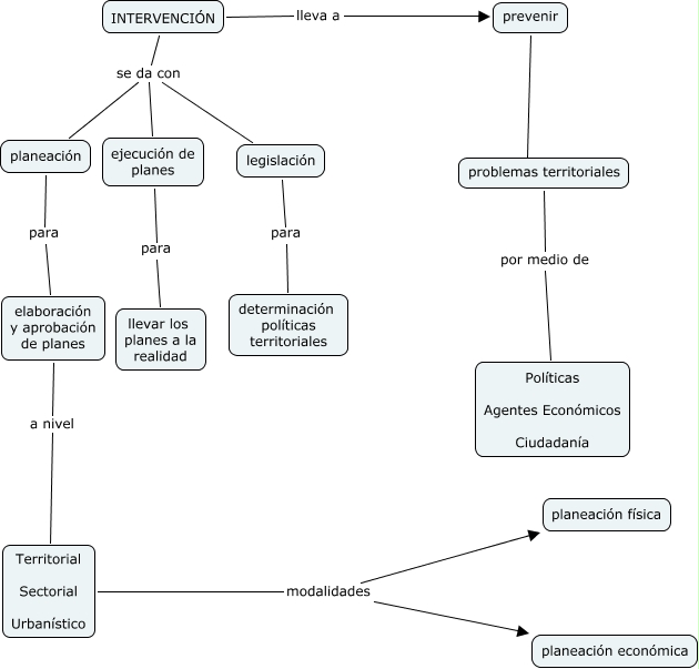 planeación territorial II, 8152, elaboración y aprobación de planes a nivel Territorial Sectorial Urbanístico, INTERVENCIÓN lleva a prevenir, legislación para determinación políticas territoriales, INTERVENCIÓN se da con planeación, problemas territoriales por medio de Políticas Agentes Económicos Ciudadanía, INTERVENCIÓN se da con ejecución de planes, Territorial Sectorial Urbanístico modalidades planeación física, planeación para elaboración y aprobación de planes, Territorial Sectorial Urbanístico modalidades planeación económica, ejecución de planes para llevar los planes a la realidad