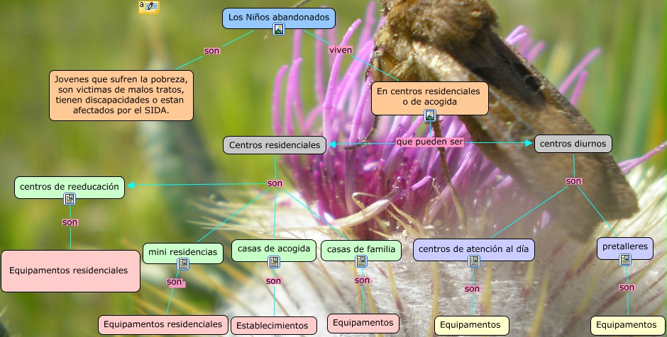 Los niños abandonados, Centros residenciales son casas de acogida, centros diurnos son pretalleres, Centros residenciales son mini residencias, casas de familia son Equipamentos, casas de acogida son Establecimientos, Centros residenciales son centros de reeducación, mini residencias son Equipamentos residenciales, centros de atención al día son Equipamentos, pretalleres son Equipamentos, En centros residenciales o de acogida que pueden ser centros diurnos