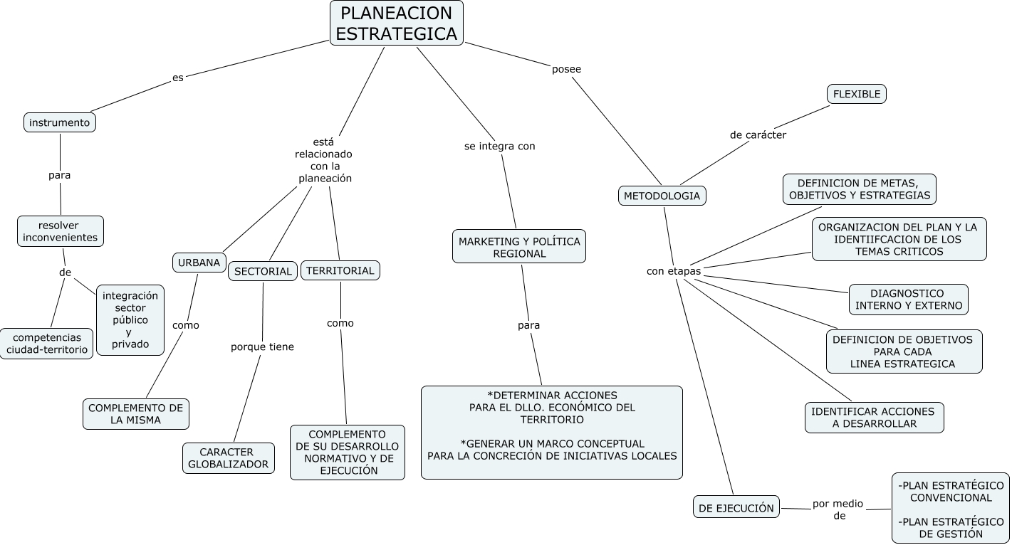 8152 CAP.10 PLANEACIÓN ESTRATÉGICA, METODOLOGIA con etapas IDENTIFICAR ACCIONES A DESARROLLAR, PLANEACION ESTRATEGICA posee METODOLOGIA, PLANEACION ESTRATEGICA es instrumento, METODOLOGIA de carácter FLEXIBLE, TERRITORIAL está relacionado con la planeación SECTORIAL, URBANA como COMPLEMENTO DE LA MISMA, resolver inconvenientes de competencias ciudad-territorio, PLANEACION ESTRATEGICA está relacionado con la planeación SECTORIAL, TERRITORIAL está relacionado con la planeación URBANA, DE EJECUCIÓN por medio de -PLAN ESTRATÉGICO CONVENCIONAL -PLAN ESTRATÉGICO DE GESTIÓN