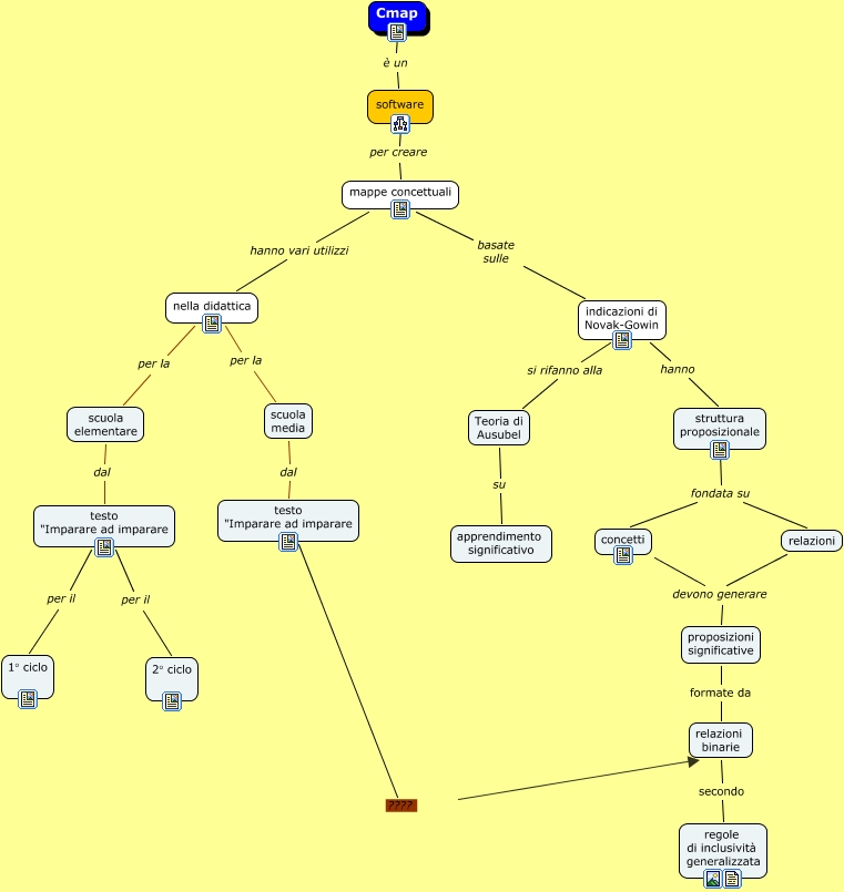 Questa Cmap, creata con IHMC CmapTools, contiene informazioni relative a: Corso delle Tic su Cmap-06, relazioni devono generare proposizioni significative, struttura proposizionale fondata su concetti, indicazioni di Novak-Gowin si rifanno alla Teoria di Ausubel, mappe concettuali hanno vari utilizzi nella didattica, testo "Imparare ad imparare per il 2° ciclo, proposizioni significative formate da relazioni binarie, testo "Imparare ad imparare ???? relazioni binarie, concetti devono generare proposizioni significative, indicazioni di Novak-Gowin hanno struttura proposizionale, scuola media dal testo "Imparare ad imparare, relazioni binarie secondo regole di inclusività generalizzata, testo "Imparare ad imparare per il 1° ciclo, scuola elementare dal testo "Imparare ad imparare, software per creare mappe concettuali, Teoria di Ausubel su apprendimento significativo, Cmap è un software, nella didattica per la scuola elementare, struttura proposizionale fondata su relazioni, nella didattica per la scuola media, mappe concettuali basate sulle indicazioni di Novak-Gowin