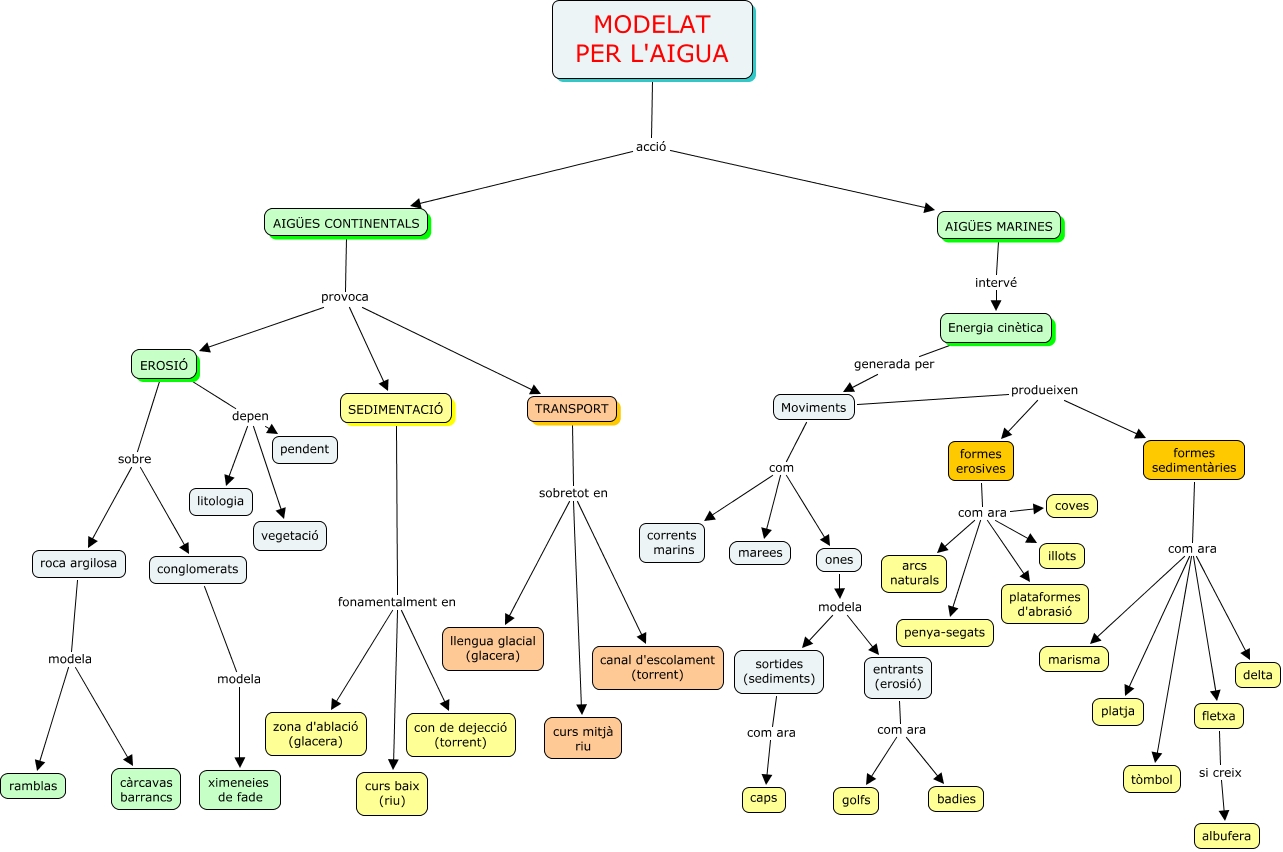 accio geologica aigua, MODELAT PER L'AIGUA acció AIGÜES CONTINENTALS, EROSIÓ sobre roca argilosa, formes erosives com ara illots, formes sedimentàries com ara marisma, sortides (sediments) com ara caps, Moviments com ones, fletxa si creix albufera, formes sedimentàries com ara tòmbol, EROSIÓ depen pendent, TRANSPORT sobretot en curs mitjà riu