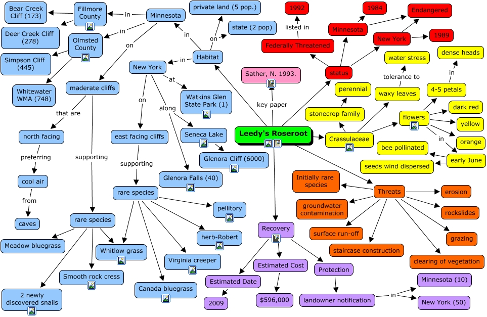 Leedy's Roseroot, Leedy's Roseroot key paper Sather, N. 1993., north facing preferring cool air, Threats clearing of vegetation, New York along Glenora Falls (40), Leedy's Roseroot Habitat, rare species pellitory, Habitat on private land (5 pop.), early June bee pollinated, flowers orange, New York on east facing cliffs