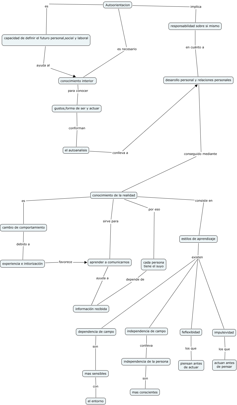 conocimiento-Julian, Autoorientacion implica responsabilidad sobre si mismo, conocimiento de la realidad por eso cada persona tiene el suyo, Autoorientacion es capacidad de definir el futuro personal,social y laboral, capacidad de definir el futuro personal,social y laboral ayuda al conocimiento interior, desarollo personal y relaciones personales conseguido mediante conocimiento de la realidad, impulsividad los que actuan antes de pensar, gustos,forma de ser y actuar conforman el autoanalisis, independencia de campo existen dependencia de campo, dependencia de campo son mas sensibles, Autoorientacion es necesario conocimiento interior