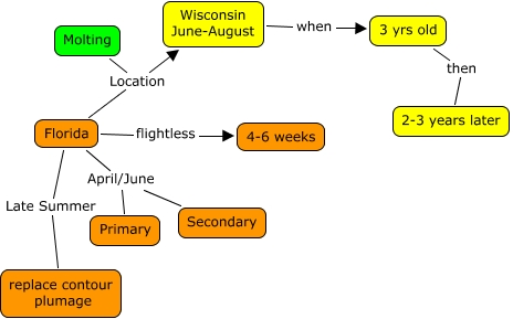 Molting, Molting Location Wisconsin June-August, 3 yrs old then 2-3 years later, Wisconsin June-August when 3 yrs old, Florida Late Summer replace contour plumage, Molting Location Florida, Florida flightless 4-6 weeks, Florida April/June Primary, Florida April/June Secondary